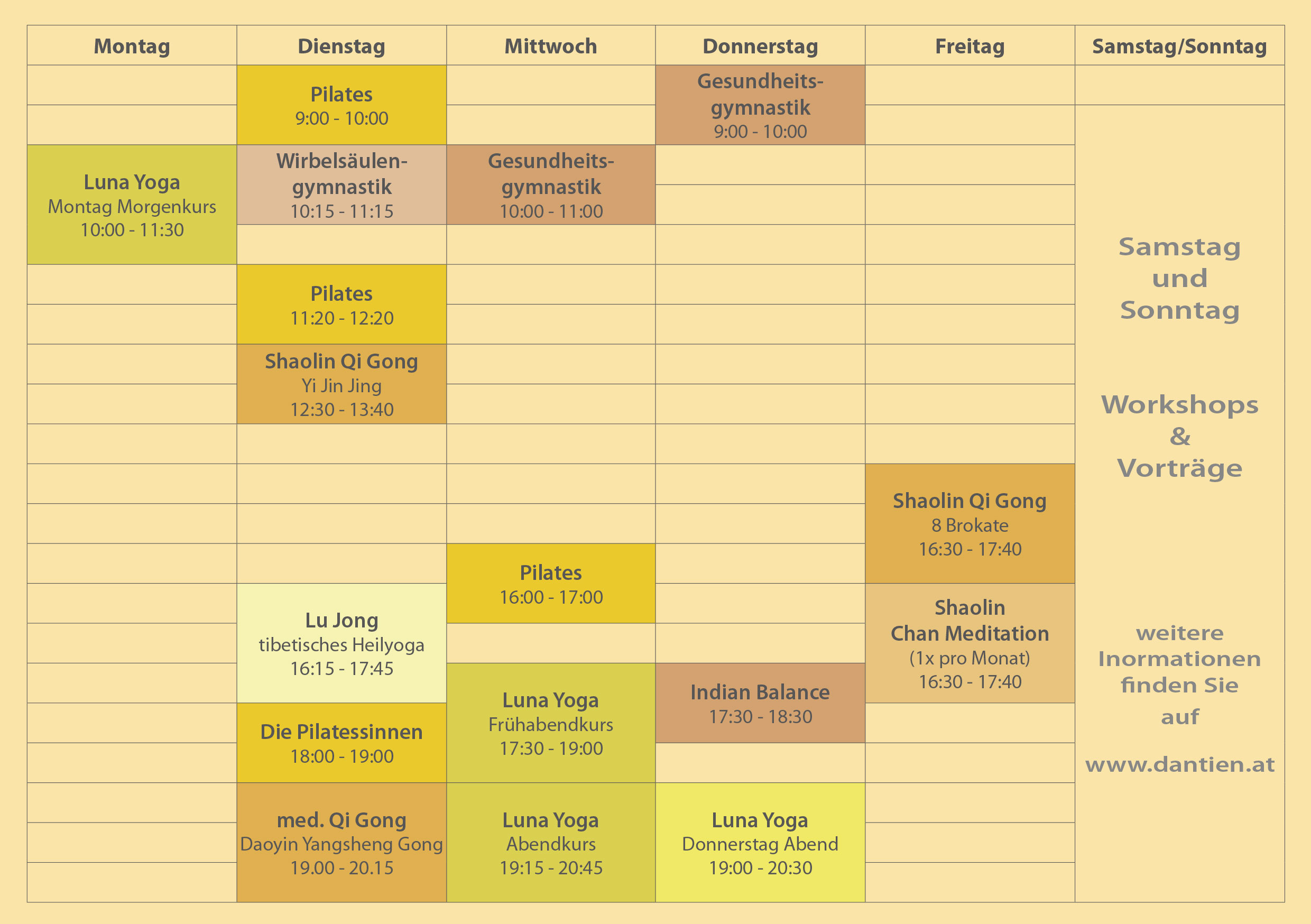 Am Freitag findet alternierend "Shaolin Qi Gong - 8 Brokate" und "Shaolin Chan Meditation", jeweils von 16:30-17:40, statt.Bitte schau dir unter der Rubrik "Kurse" die genauen Kursdaten an.